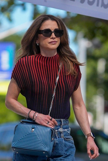 Несмотря на восточное происхлждение, Рания входит в список королев, которые одеваются не только традиционно, но и модно. Например, для своего последнего выхода на выставку Art Basel монарх надела широкие синие джинсы, которые сочетала с сюрреалистичным топом. Выход завершила сумка голубого оттенка и легкая укладка.