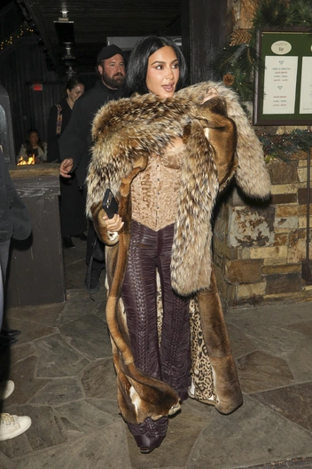 Пока другие селебрити демонстрируют в Аспене старую добрую «тихую росокшь», Ким выбирает противоположную стратегию и превращает улицу в подиум Roberto Cavalli: поверх бордовых кожаных брюк с плетеным эффектом и бархатного корсета она накидывает винтажную шубу Cavalli с леопардовым подкладом и массивным меховым шарфом, заодно окончательно закрепляя за собой титул королевы винтажных шуб и настоящей поп-дивы современности.