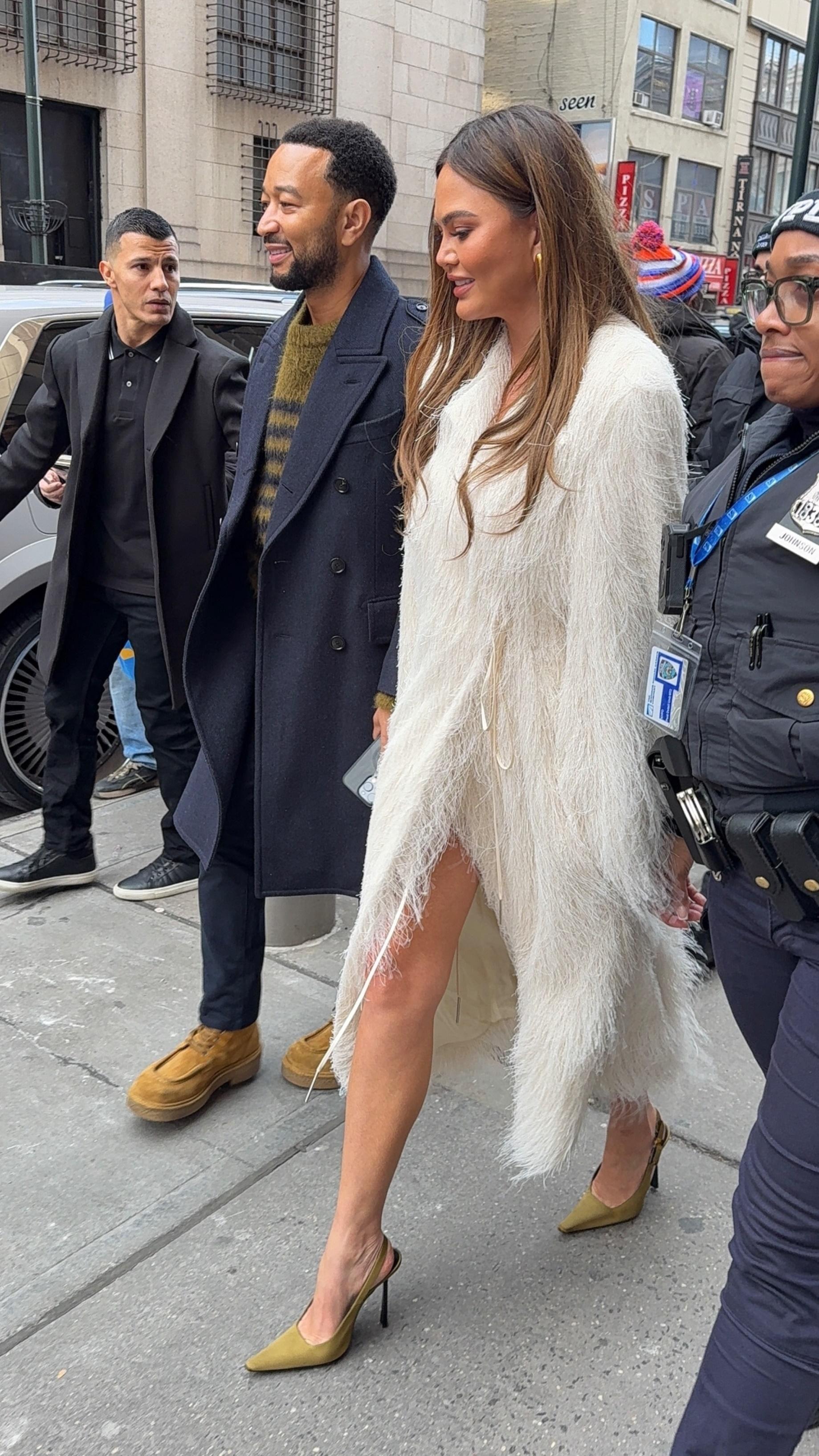 Крисси Тайген показывает, что мы будем носить в 2026 году — платье в перьях как полноценная зимняя «шуба» для светских выходов. Ее белоснежный пушистый наряд со смелым разрезом выглядит как коктейль из вечернего платья и уютного пледа, так что в нем можно и не мерзнуть, и сиять на улицах Нью‑Йорка. Лаконичные лодочки нежно‑оливкового оттенка и минимум украшений позволяют перьевой текстуре быть в центре внимания, превращая каждый шаг Крисси в маленькое дефиле и намекая всем нам: в 2026‑м драматичный фактурный текстиль будет на пике.