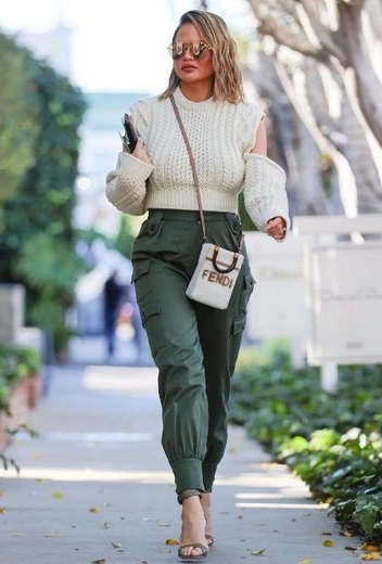 Брюки карго — один из самых неоднозначных фэшн-трендов последних лет: и дело не только во вкусовых предпочтениях, но и в том, что для такой модели брюк удачное модное решение приходит в голову далеко не сразу — да и вариаций сочетаний с ней куда меньше, чем с классическими фасонами. Для тех, у кого довольно сложные отношения с брюками карго, предлагаем обратить внимание на вариант лука с их участием от Крисси Тейген. Звезда выбирает модель на высокой посадке в темно-зеленом тоне, комбинируя ее с укороченным светлым свитером с вырезами на руках и открытыми туфлями на каблуке. Аутфит завершают мини-сумка Fendi и солнцезащитные очки в золотом тоне.