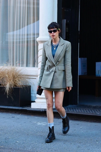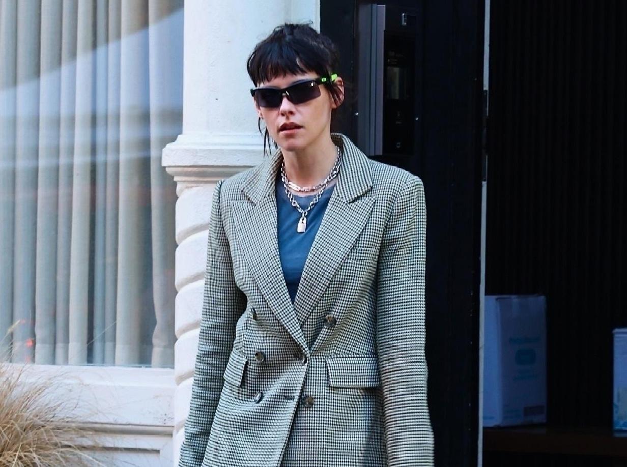 Кристен выходит на улицу в максимально «своем» образе — нервном, немного панковом и при этом безупречно собранном. Укороченный костюм в мелкую клетку сидит как мини-платье-жакет: четкая линия плеч, двойная застежка, карманы с клапанами и очень провокативная длина, открывающая ноги полностью. Снизу — простая синяя футболка, которая «приземляет» строгий пиджак и делает образ нарочито неформальным, словно она надела любимый офисный жакет поверх домашней майки. Кажется, будто она вообще не старалась, но именно эта небрежность и возвращает Кристен в ее модный прайм — когда любой минималистичный аутфит внезапно превращается в сильное высказывание.