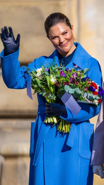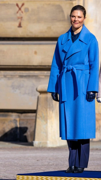 Кронпринцесса Швеции выглядит бесподобно в синем тотал-луке. Его она собрала из темной блузы с бантом на воротнике и классических костюмных брюк со стрелками. В качестве верхней одежды Виктория выбрала более яркое пальто-халат с накладными карманами — такая модель никогда не потеряет своей актуальности. К праздничному образу она подобрала кожаные перчатки, остроносые сапоги и минималистичные серьги.