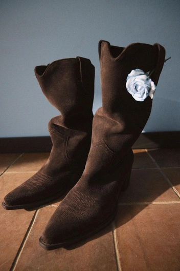 Завершить образы можно аксессуарами и обувью из замши: тонким ремнем, казаками или туфлями на устойчивом каблуке. В качестве финального штриха подойдут массивные металлические украшения в винтажной эстетике — серьги и браслет.