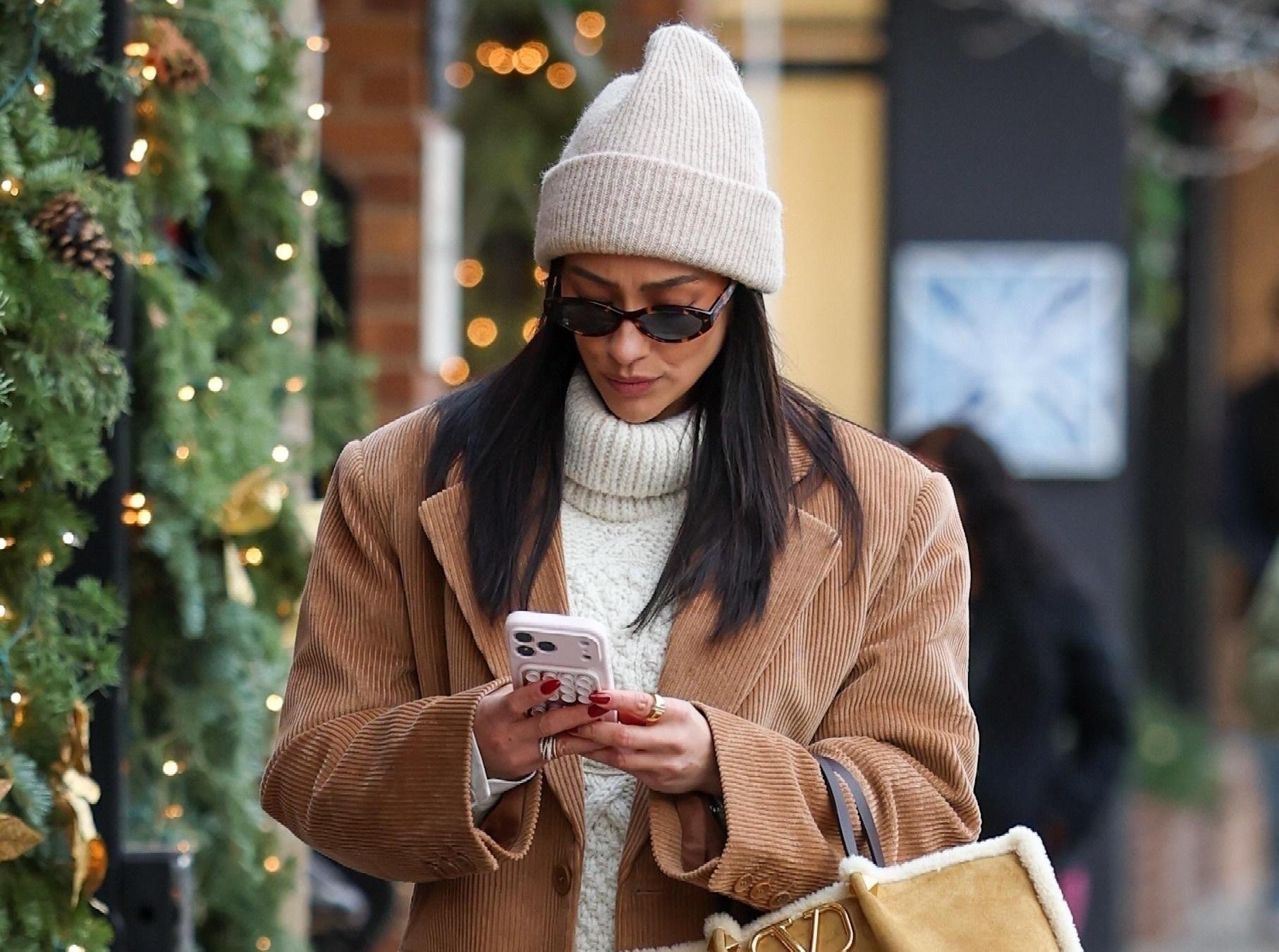 Шэй Митчелл уверенно ломает все модные стереотипы: актриса собирает светлый Тотал-лук из молочного трикотажного свитера, юбки и уютной шапки, а сверху добавляет карамельный вельветовый жакет, чтобы образ выглядел еще более теплым и уютным. Огромная замшевая сумка‑тоут от Valentino и змеиные ботильоны делают комплект еще интереснее по текстурам, доказывая, что зимний гардероб может быть светлым, практичным и при этом очень стильным.