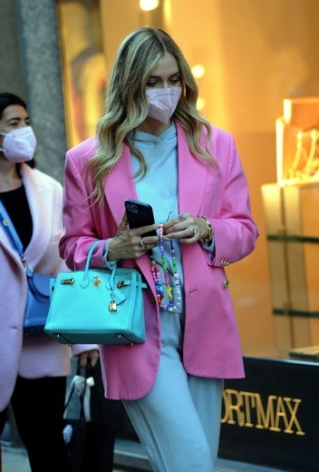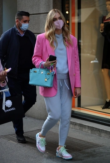 В ожидании второго ребенка Кьяра Ферраньи не сидит сложа руки и продолжает заниматься своими бизнес-проектами, обеспечивая себе достаточно активную беременность. Знаменитость можно часто заметить в центре Милана во время шопинга или деловых встреч, для которых она не жалеет минут, проведенных перед зеркалом за выбором стильного аутфита. Весной звезда переходит на приятные пастельные оттенки голубого и розового, которые являются колор-фаворитами в гардеробе Кьяры. Девушка примеряет брючный полуспортивный костюм в светло-голубом оттенке, который комбинирует с розовым жакетом, кроссовками и небольшой голубой сумкой.