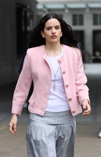Испанскую певицу заметили на прогулке по Лондону. Под укороченный приталенный пиджак в йогуртово-розовом оттенке — а это, кстати, главный цвет осени — Розалия надела базовую белую футболку. Из украшений лишь колье с массивным ключом. Самое интересное начинается дальше: артистка решила не придумывать велосипед и выбрала юбку в светло-сером оттенке, составляющую бессмертное комбо с розовым. Длина ниже колена, низкая посадка и немного винтажный вид — Розалия смело заигрывает со стилем-альт, сочетая его с классикой. Неформальности виду придают массивные грубые сапоги из новой коллекции Dior.