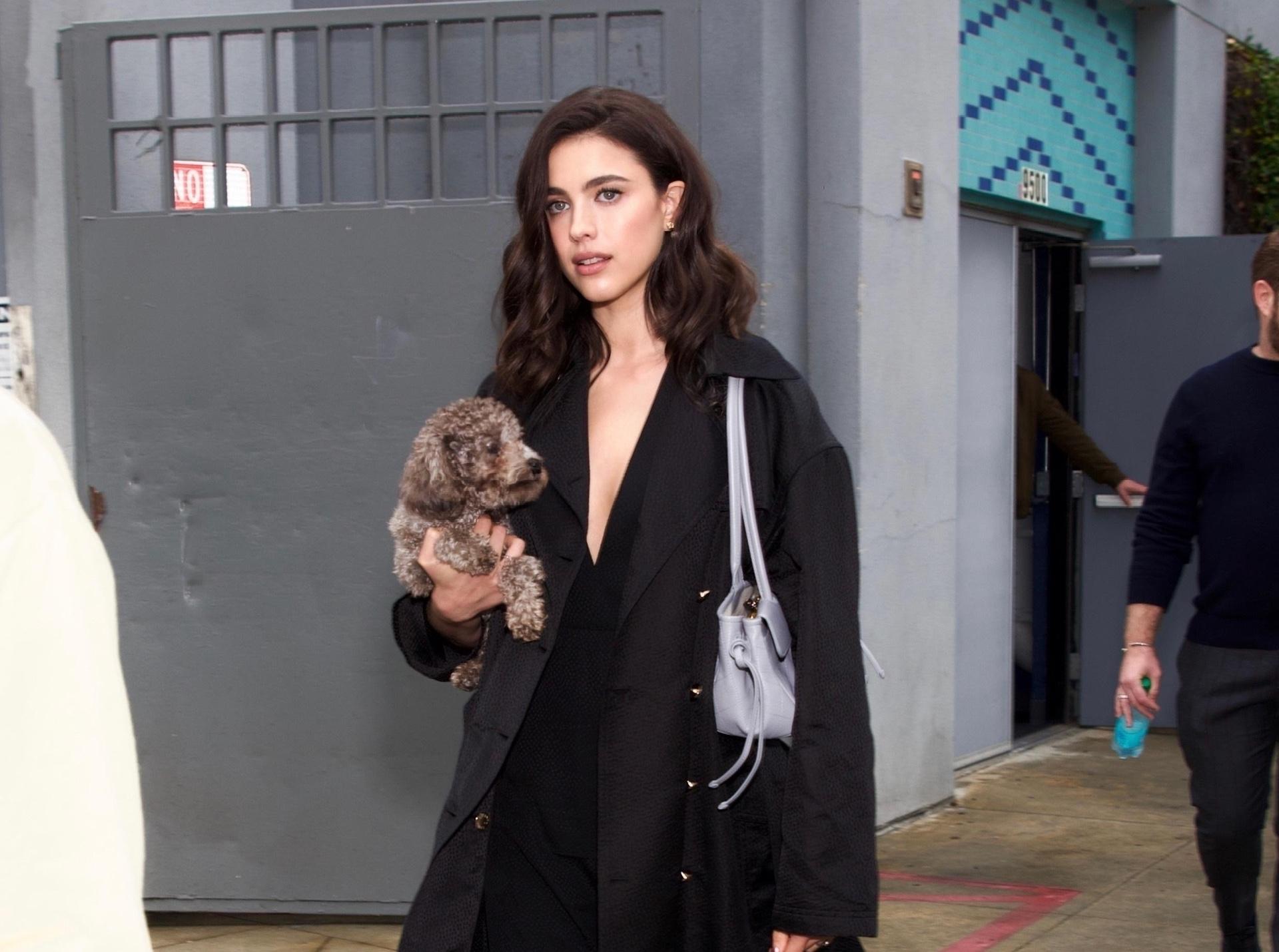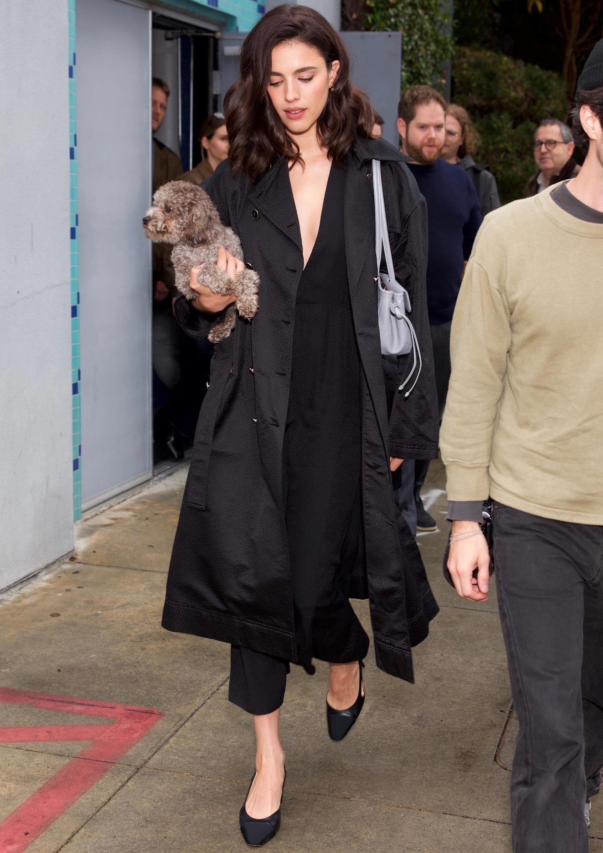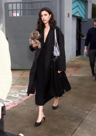 В этот пасмурный калифорнийский день Маргарет Куолли выбирает беспроигрышную формулу: монохром, расслабленность и утонченные детали. Черный тренч с выразительными объемными лацканами и широким поясом становится драматичной основой для минималистичного платья-миди — и ни одной лишней детали. Лаконичные слингбэки не только подчеркивают изящество образа, но и усиливают его элегантность, а серая сумка с голубоватым оттенком нежно освежает строгий total black, добавляя нотку легкости и современности.
