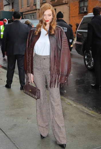 Вещи из кожи продолжают атаковать сезонные тренд-листы и не дают покоя светским модницам и знаменитостям. Некоторые из них стараются экспериментировать со стилем, демонстрируя собственные прочтения старой новой тенденции на самый популярный материал последних нескольких лет, а некоторые остаются верными классическим вариантам, как, например, американская актриса кино Ларсен Томпсон. Так, девушка отдает предпочтение кожаным вещам в темных оттенках бордового и в черном, эффектно комбинируя кожанку, клетчатые расклешенные брюки и обычную белую майку.