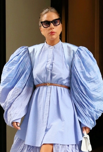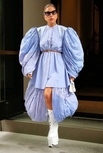 Певица продолжает штурмовать стритстайл Нью-Йорка в колоритных аутфитах и удивлять нас оригинальными фэшн-решениями. Звезда удачно миксует классику делового стиля и старый добрый эпатаж, который раньше был ее фирменной карточкой. Этим летом Гага возвращает в свой повседневный гардероб сапоги на высокой платформе и шнуровке, которые стильно смотрятся как с выдержанными, так и с откровенными аутфитами. Модель обуви в белом цвете она сочетает с голубым платьем с пышными рукавами и летящей нижней отделкой. Лук дополняют черные солнцезащитные очки и белая мини-сумка.