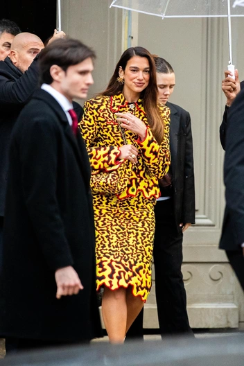 Дуа выводит анималистичный принт на максимальный фешн-уровень: вместо привычной леопардовой палитры — неоново‑желтый твид с огненно‑красным узором, который выглядит как расплавленный звериный мотив из будущего. Жакет, юбка‑карандаш и объемная сумка от Chanel собраны в идеальный тотал‑лук, а гладкие волосы и золотые серьги оставляют принту всю сцену — именно так леопард перестает быть клише и превращается в полноценное высказывание Высокой моды.