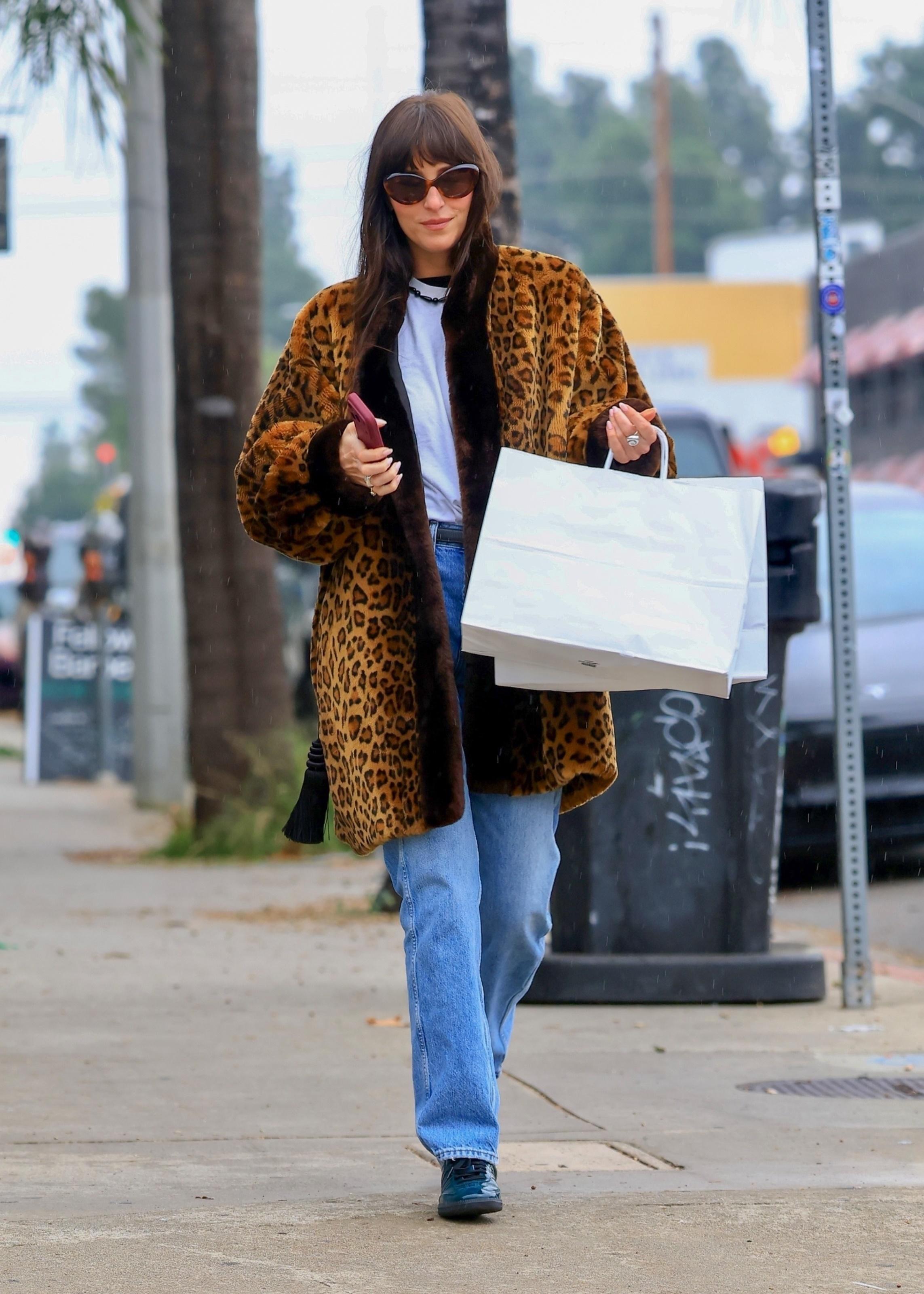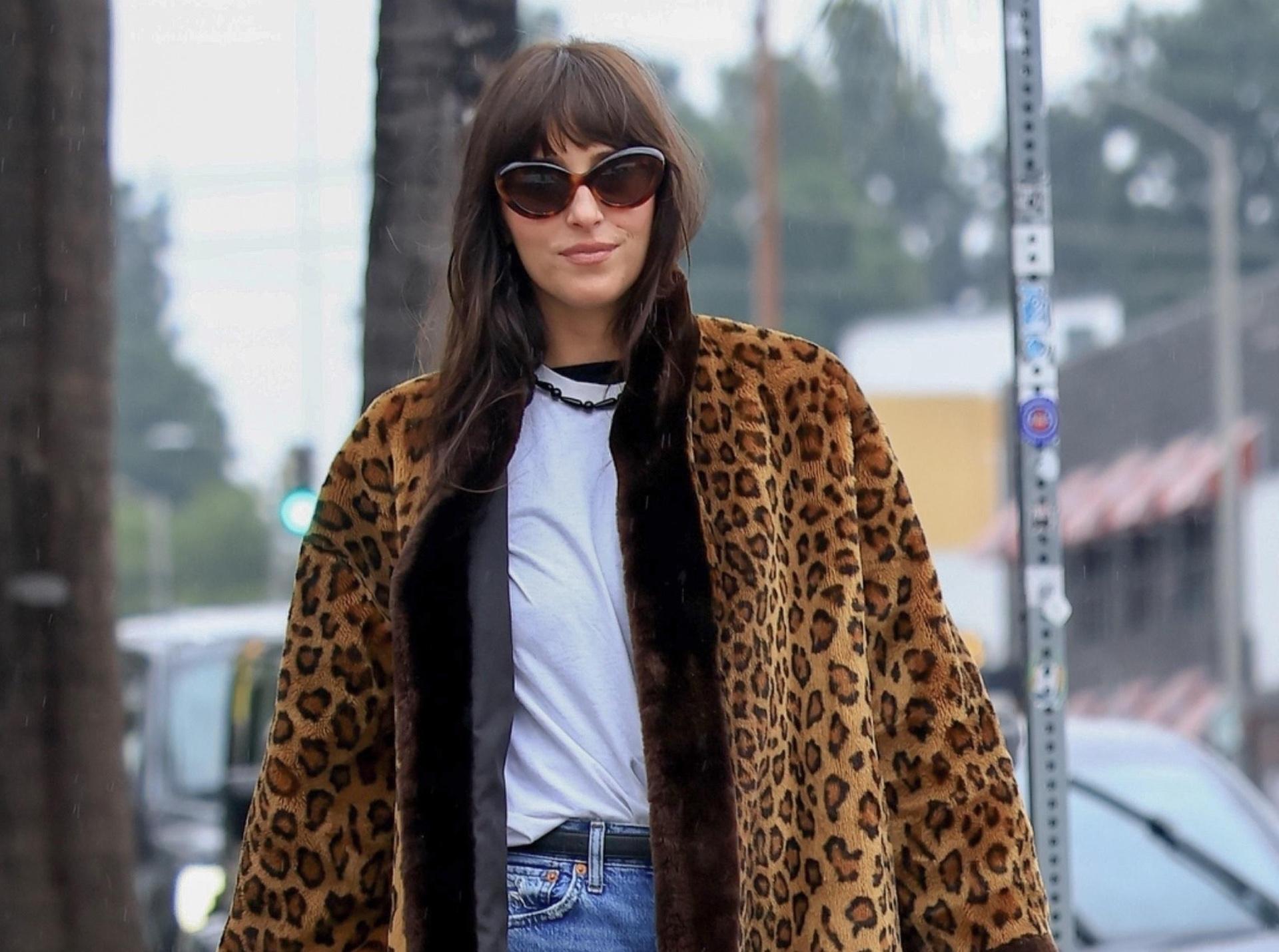Дакота Джонсон на будничном шопинге выглядит так, будто вышла из инди‑фильма про Лос‑Анджелес: объемная леопардовая шуба поверх белой футболки и свободных винтажных джинсов превращает базовый сет в выверенный модный жест. Леопард здесь — не про драму, а про иронию: в паре с простыми кедами он смотрится максимально приземленно, как будто это просто ее «любимое старое пальто», в котором удобно бегать по делам. Очки‑кошки подчеркивают кинематографичность образа, а расслабленная посадка джинсов и незаметные аксессуары удерживают баланс между гламуром и повседневностью, за который стиль Дакоты так любят.