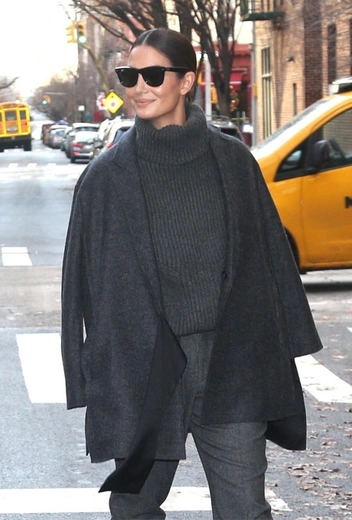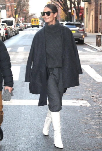 Стиль минимализм интересно выглядит не только летом – зимой среди лаконичных и сдержанных вещей можно также найти немало интересных ансамблей. Лили Олдридж и вовсе решила взять за основу темно-серый цвет, который в ее интерпретации совсем не выглядит скучно. Она составила образ из свитера, брюк и жакета в одной палитре, а изюминку наряду добавили белые сапоги, которые стали ярким акцентом наряда.