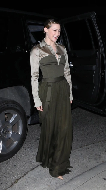 Тренд на винтаж — один из самых популярных в этом сезоне. Выдержать образ в этом стиле получилось у Лили Рейнхарт: американская актриса безупречно справилась с цветовой палитрой и сочетанием материалов. Она примерила шелковую блузу с корсетной вставкой в темно-зеленом оттенке и заправила ее в эффектную макси-юбки с поясом. К вечернему образу звезда подобрала бежевые туфли с острым мысом и минималистичные украшения.