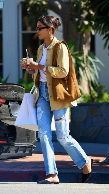 На улице теплеет, а это значит, что пора надевать более легкую одежду и экспериментировать со своим гардеробом. Лора Харриер предлагает этой весной выбирать светлые оттенки, которые придают нашей коже сияние и свежесть. Звезда была замечена в базовой белой футболке и рваных голубых джинсах на высокой посадке. К ним она подобрала легкий жакет, замшевые мюли и модную коричневую сумку.