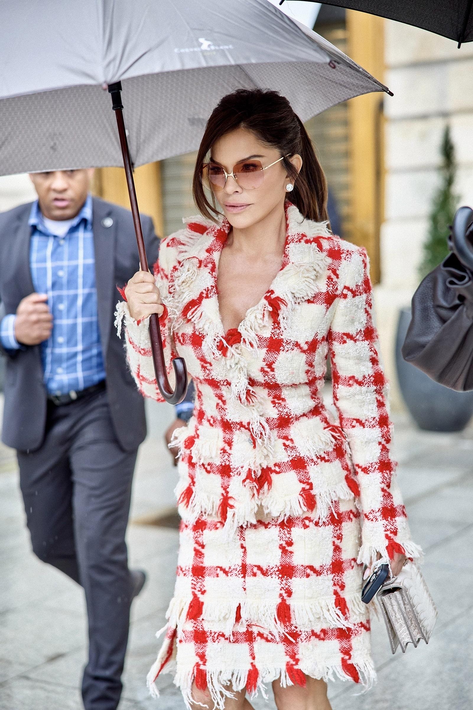 Во время этой Недели моды Лорен Санчес решила напомнить, что ее имя тоже должно звучать на первых строчках фешн‑дайджестов: на улицах Парижа она появилась в архивном костюме Versace 2004 года с ярко‑красной твидовой клеткой и нарочито небрежной бахромой, которая особенно актуальна в этом сезоне. Белые туфли Jimmy Choo и структурированная сумка Schiaparelli подхватывают идею «богатого шика», а зонт и идеально уложенный хвост превращают выход под дождем в полноценный подиумный кадр.
