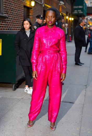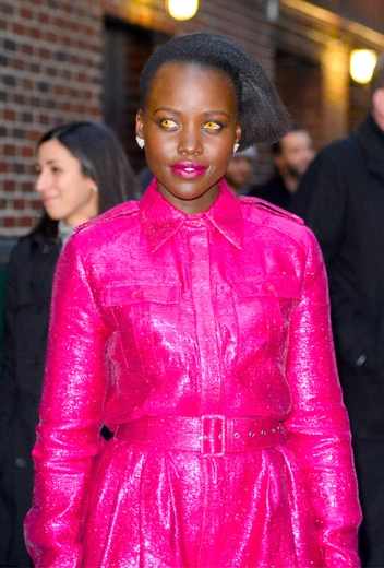 Лупита Нионго всегда знает, как эффектно появиться перед публикой и чем действительно стоит удивлять. На шоу Стивена Кольбера она появилась в мерцающем комбинезоне Bande Noir оттенка слепящей фуксии из осенне-зимней коллекции 2019-20 и туфлях Sergio Rossi из ПВХ. Завершало образ довольно эпатажное дополнение – желтые контактные линзы. Исполнительница главной роли в триллере Джордана Пила «Мы» эпатирует таким аксессуаром уже во второй раз: в цветных контактных линзах она появлялась и на премьере картины в Лондоне.