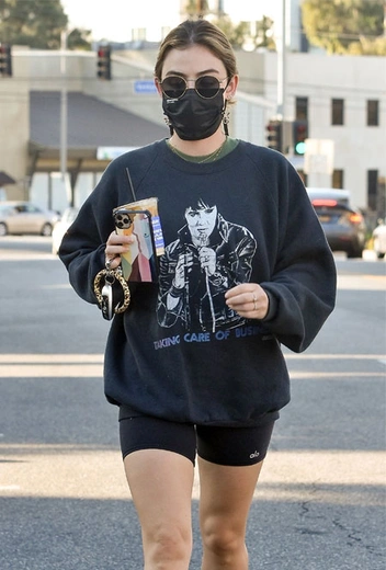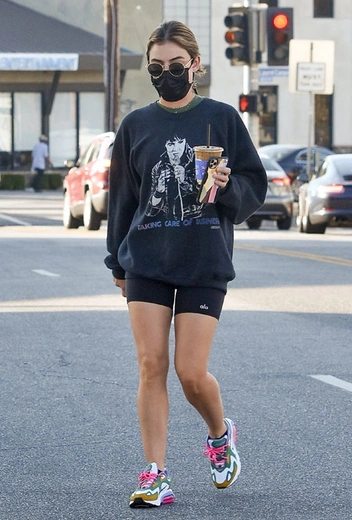 Люси Хейл обожала спортивные наряды еще до того, как мы все облачились в расслабленные домашние аутфиты. Велосипедки, кроссовки, худи и леггинсы – ее привычные повседневные вещи. Особенно крепкую любовь звезда питает ко всем вариациями свитшотов – как ярких оттенков, так и более сдержанных. Недавно она показала идеальный вариант, которые можно носить и на тренировку, и на встречу с друзьями. Девушка выбрала укороченные велосипедки, объемный черный свитшот с принтом и красочные кроссовки с контрастными вставками.