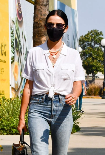 Люси Хейл – настоящая любительница готовых рабочих комбинаций, которые легко адаптировать под разные жизненные ситуации. Одна из таких популярных формул – лаконичная белая рубашка с коротким рукавом и mom-джинсы с завышенной талией. Этот аутфит знаком многим, и чтобы сделать привычный наряд более интересным, девушка использует стилистический прием – к лаконичным вещам Люси добавляет акцентную обувь и необычные детали. Так, в новом образе она решает сочетать сандалии с заклепками и трендовые бисерные украшения, которые отлично уживаются в одном наряде.