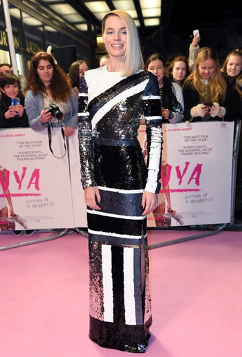 Актриса Марго Робби на лондонской премьере своего нового фильма «Тоня против всех» (I, Tonya) появилась в сверкающем монохромном платье Louis Vuitton, от подола до краешка воротника расшитом пайетками.