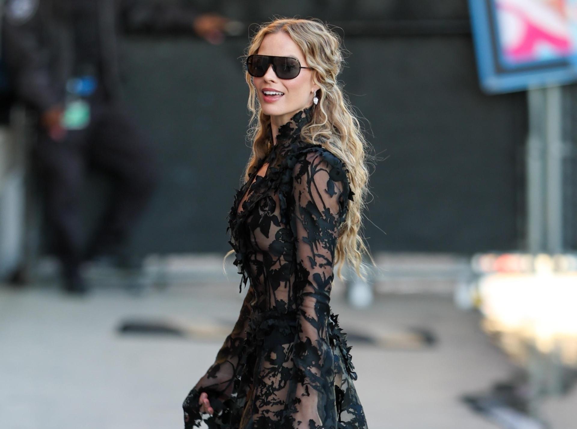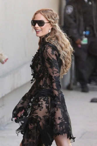 Актриса меняет барбикор на мрачный романтизм: полупрозрачное черное платье с вышитыми аппликациями выглядит как ожившая готическая иллюстрация к роману Бронте. Рваный край, длинные рукава‑клеш и тонкие босоножки подчеркивают воздушность силуэта, а светлые волнистые волосы добавляют контраст, из-за которого образ кажется еще более призрачным — будто героиня Марго вышла не с вересковых холмов, а прямиком с обложки глянцевого журнала.