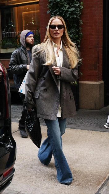 Если вы думали, что Марго Робби основательно поселила в своем повседневном гардеробе розовый цвет, то спешим вам показать недавний модный выход актрисы и доказать обратное. Знаменитость отдала предпочтение многослойности и надела белую майку-алкоголичку, свободную рубашку удлиненного кроя и серый плащ, напоминающий по фасону пиджак. На низ она надела эффектные расклешенные джинсы в сочетании с кожаными сапогами. Завершили выход плетеная сумка и узкие очки.