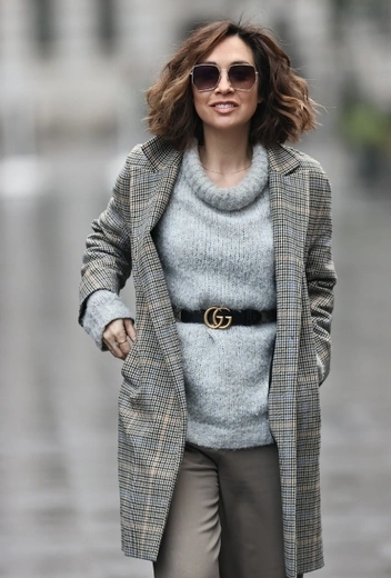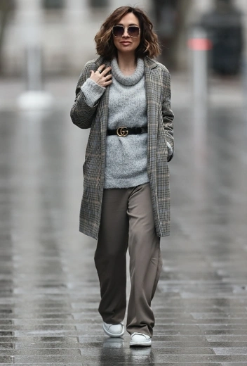 Зимой стильной альтернативой черно-белой палитре становится гамма серых оттенков, которые особенно уютно смотрятся на шерстяных и трикотажных тканях. Майлин Класс предпочитает сочетать разные вариации серого в одном тотал-луке — так они лучше подчеркивают друг друга и создают законченный аутфит, подходящий для любого жизненного случая. Телеведущая также добавляет в него светло-бежевый и белый оттенки, которые приятно освежают casual-образ.