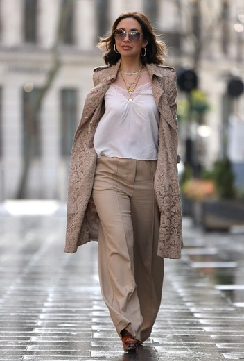 Крем-брюле, латте, шоколад — с наступлением весны стритстайл-повестка традиционно окрашивается именно в их оттенки. В поисках романтичного настроения знаменитости обращаются к ним на регулярной основе и в результате добиваются своей цели. Британская певица Майлин Класс идет дальше и дополняет сезонный образ изящным кружевным пальто и элегантной блузой из хлопка. Аутфит завершают открытые туфли и солнцезащитные очки.
