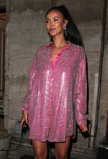 Последнее время звезды особенно сильно полюбили розовый. И это не удивительно: сочетается он с огромной палитрой оттенков, а выглядит всегда ярко и броско – что еще нужно селебрити, чтобы попасть в заветный список самых модных? На это и сделала ставку 24-летняя телеведущая Майя Джама, выбрав мерцающее платье-рубашку длины мини и белые ботильоны. Просто и ярко!