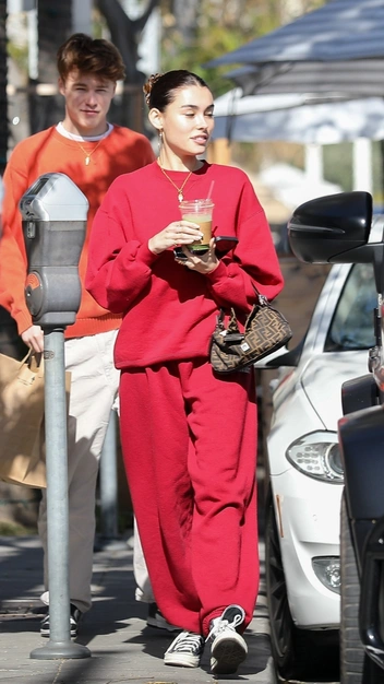 За время пандемии хлопковые костюмы с джоггерами и свитшотами стали настоящей униформой всех модниц. Герои стритстайла до сих пор не готовы от них отказываться. Мэдисон Бир, например, выбирает модель насыщенного красного оттенка. Свой oversize-комплект селебрити сочетает с черными кедами Converse и сумкой Fendi со знаковой монограммой модного Дома.