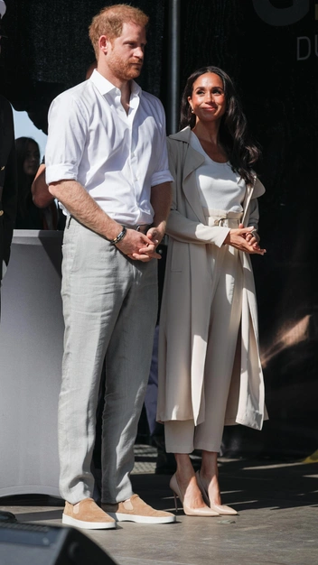Меган Маркл выглядит безупречно: на мероприятии она появилась в элегантном образе, который отлично впишется как в деловой дресс-код, так и в вечерний. Герцогиня примерила белоснежную майку и брюки-кюлоты на высокой посадке с широким поясом, и дополнила она выход легким плащом пудрового цвета. Завершением образа стали стильные туфли лодочки с острым мысом и тонким каблуком, а также минималистичные украшения.