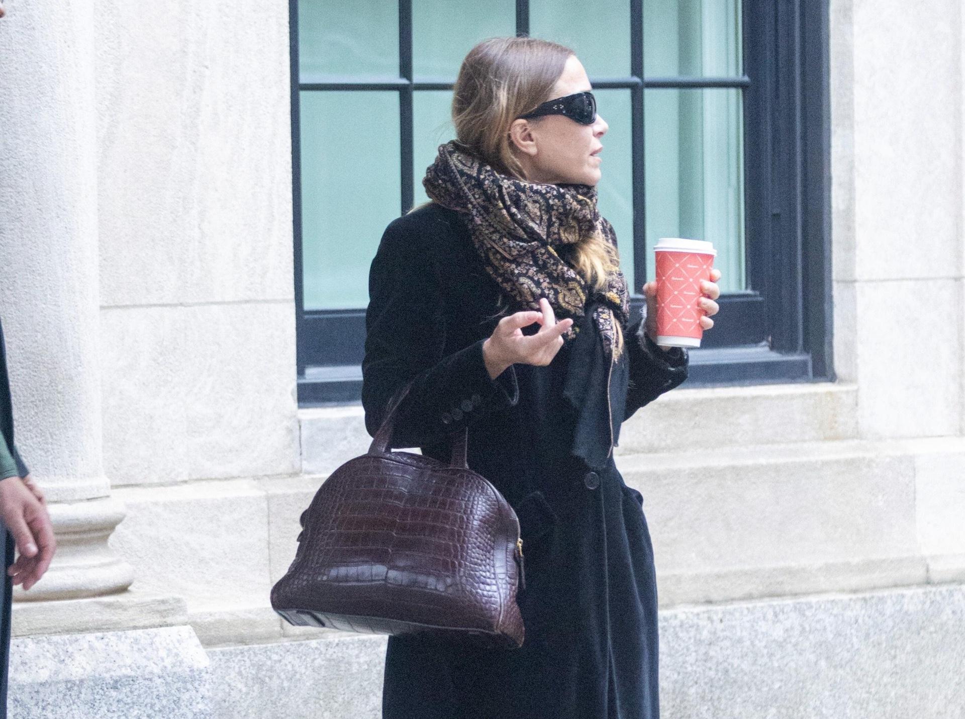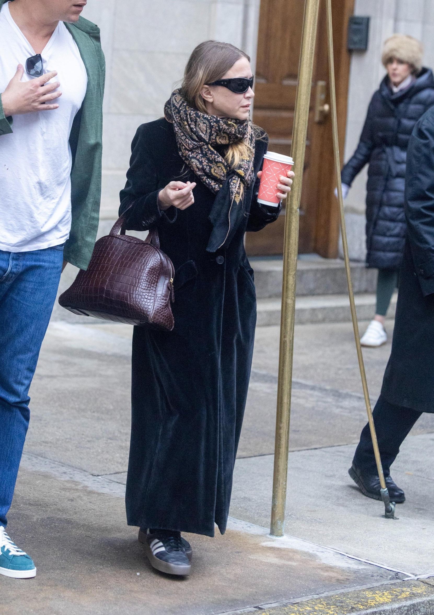В этом выходе Мэри‑Кейт в очередной раз доказывает, что «тихая роскошь» живет в деталях: длинное черное бархатное пальто‑халат The Row, объемный богемный шарф, винная кроко‑сумка, напоминающая винтажный дорожный баул, и нарочито простые черные кроссовки — все вместе выглядит так, будто это случайный набор вещей, хотя каждый элемент отточен до миллиметра и собирает образ женщины, для которой люкс — не изыск, а привычная среда обитания.