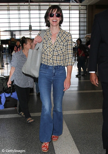 40-летняя голливудская звезда прибыла в аэропорт Лос-Анджелеса днем в минувшую пятницу. Путешествовать актриса предпочта в удобных джинсах-клеш, клетчатой рубахе и красных босоножках на пробковой танкетке.
