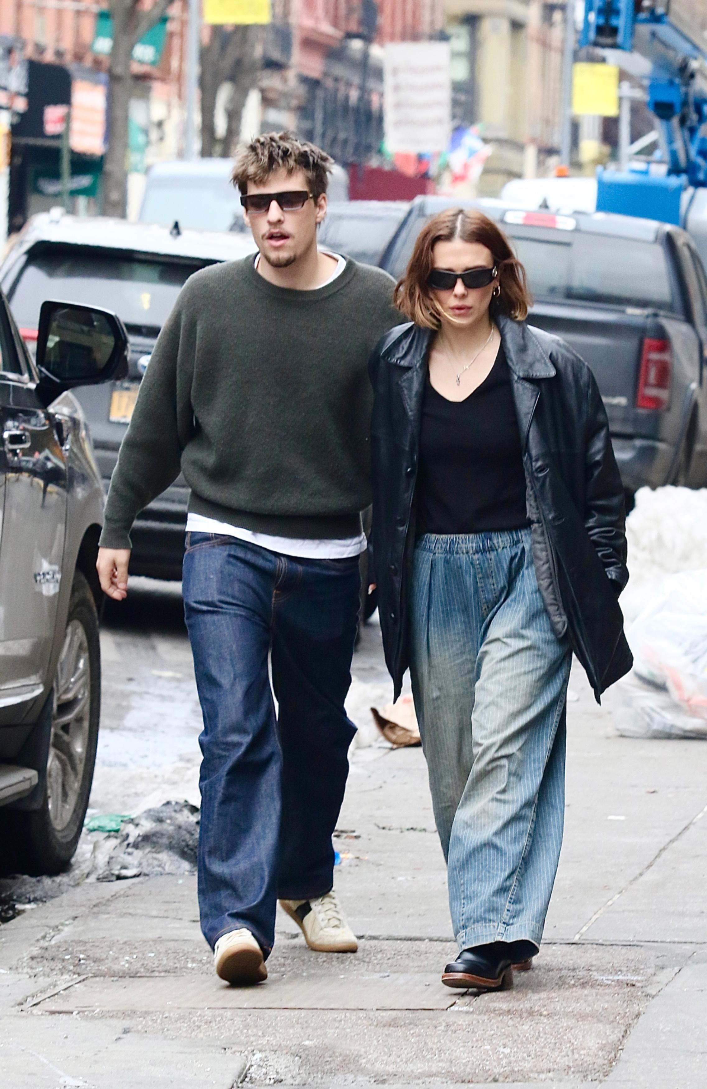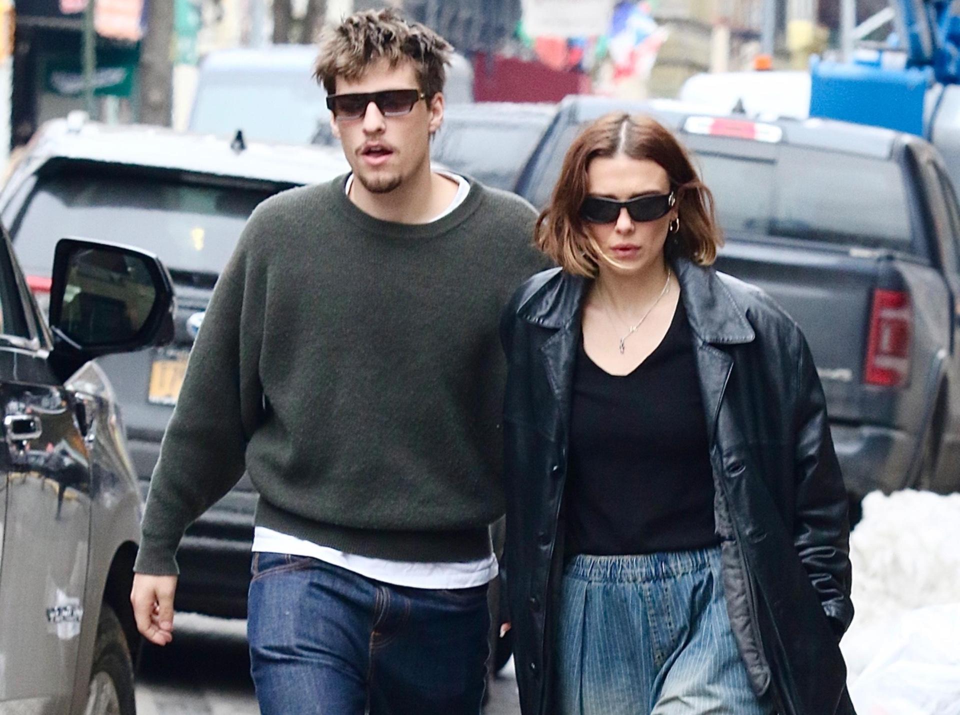 В свой день рождения Милли снова полагается на проверенное стайл‑комбо «объемный верх + широкие брюки + массивная обувь»: черный базовый топ, кожаная рубашка‑жакет в духе 90‑х и ранних аутфитов Вайноны Райдер, пинстрайп‑джинсы, лаконичные ботинки и овальные очки Dior делают темный тотал-лук по-своему кинематографичным, так что прогулка по Сохо больше похожа на кадр из «Love Story», чем на обычный выход на поздний завтрак.
