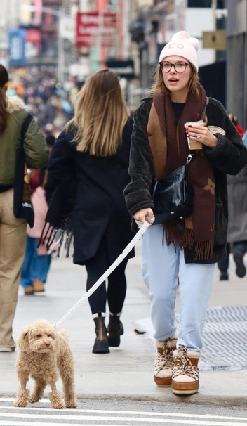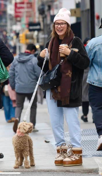Подбирать образ под цвет машины — прошлый век! Сейчас знаменитости составляют образы под своих домашних питомцев. Например, Милли Бобби Браун выбрала мунбуты с бежевой овечьей шерстью, которые идеально сочетаются с ее собачкой мальтипу. К слову, такая удобная и теплая обувь сейчас в моде — носим ее с кэжуал образом с джинсами и крупным шарфом, как у актрисы.