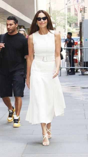 Как вы думаете, почему монаршие особы и супруги президентов на публичных мероприятиях всегда появляются в платьях-футлярах? Нет, не только потому, что эти модели выглядят строго и вписываются в деловой дресс-код. Они также за счет плотного материала скрывают проблемные зоны и стройнят фигуру. Такое платье выбрала для себя и Минни Драйвер: она отдала предпочтение фасону с открытыми плечами, поясом и трапециевидной юбкой.