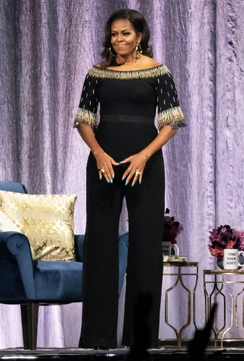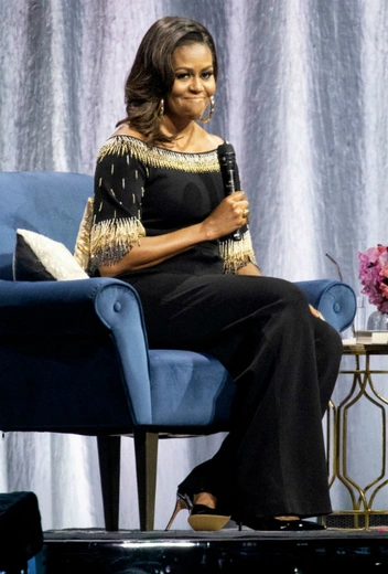 Мишель Обама продолжает свой промоушн-тур, посвященный книге «Становление». Тур носит говорящее название Becoming: An Intimate Conversation With Michelle Obama: Мишель решила поговорить с публикой на многие личные и неличные темы, касающиеся ее опыта первой леди США и общей политической ситуации. Мишель также высказалась на тему медиапространства: «Перестаньте обсуждать все в телефонах и начните стучаться в двери». Для выхода на сцену Мишель выбрала женственный брючный костюм с золотыми декоративными элементами и классические туфли-лодочки.