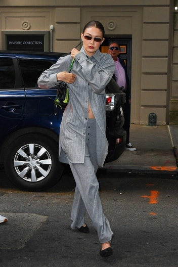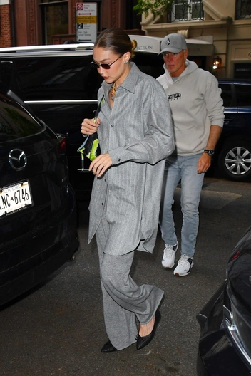 Один из трендов 2025 года — это пижамный стиль, и Джиджи Хадид применила его в своем образе. Модель надела расслабленные серые брюки из кашемира, которые дополнила удлиненной рубашкой.