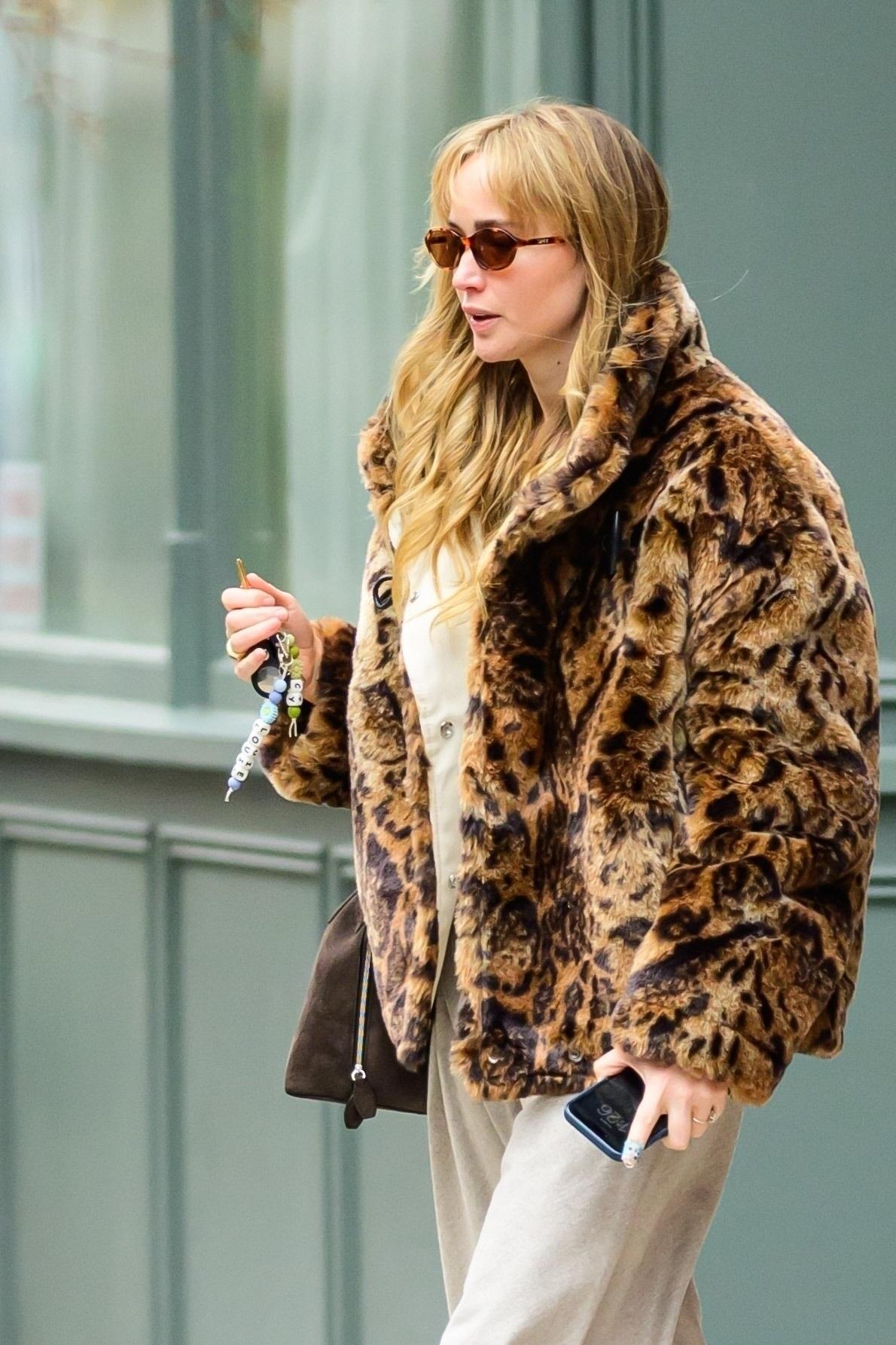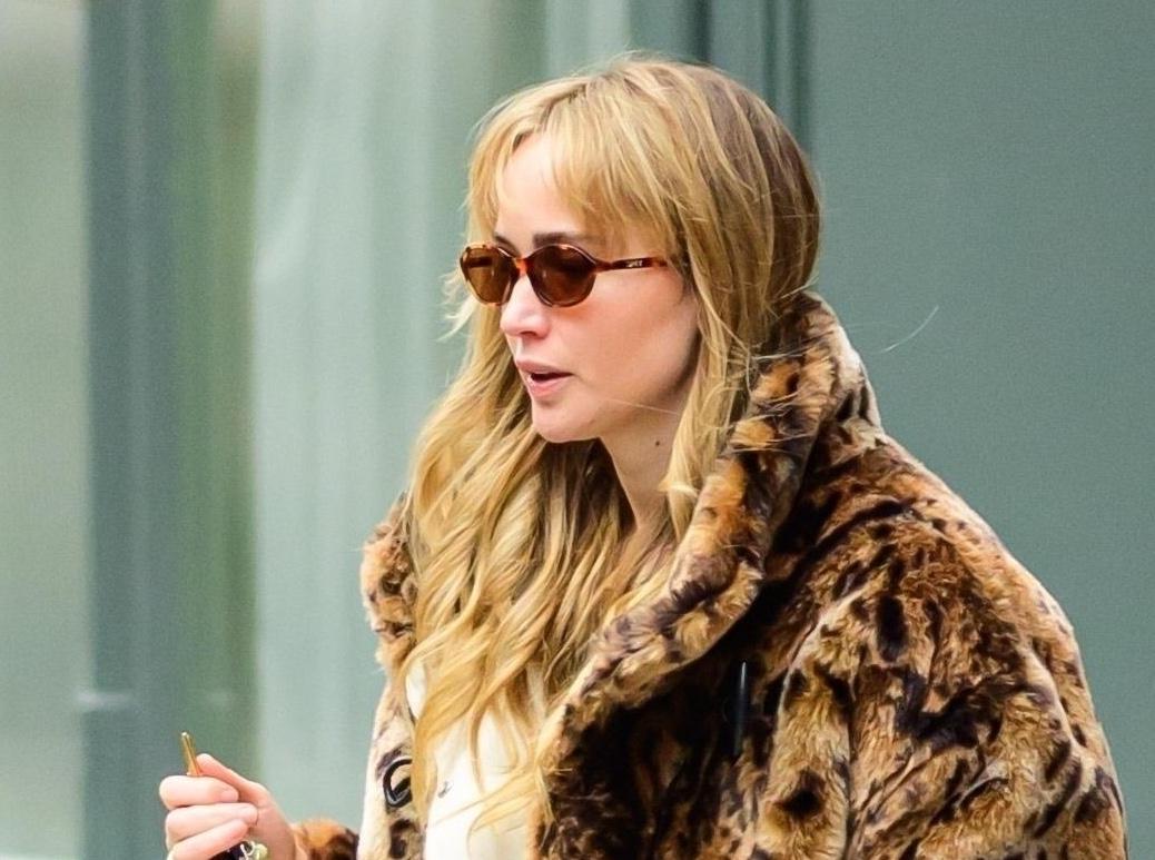 Актриса выгуливает сразу два главных зимних тренда — леопард и уютный «домашний» низ: объемную шубу Jacquemus с анималистичным принтом она сочетает с мягкими светло‑серыми трениками и внезапным акцентом в виде ярко‑бирюзовых балеток, которые моментально освежают весь образ. Компанию этому расслабленному миксу составляет структурированная коричневая сумка‑трапеция, которой Дженнифер как будто напоминает: да, можно выйти из дома прямо в спортивных штанах, но один модный леопардовый верх и пара цветных тапочек превращают лук в референс для всех, кто хочет выглядеть модно и чувствоать себя комфортно одновременно.