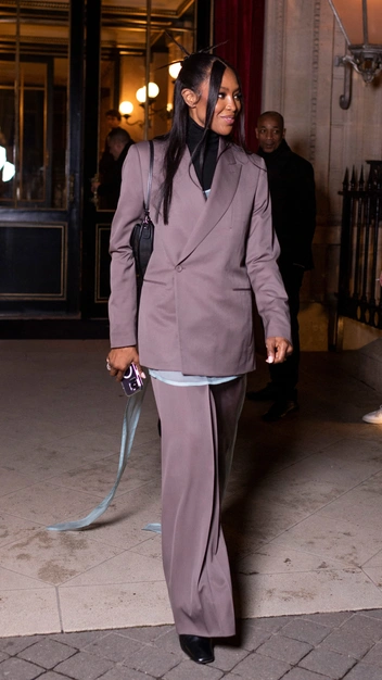 Супермодель выглядит сногсшибательно в наряде, который она приготовила для парижской Недели моды. Наоми Кэмпбелл появилась в вечернем брючном костюме в бледно-фиолетовом оттенке, под пиджак она надела черный бадлон и дополнила образ полупрозрачной белой блузой со шлейфом. Идеально вписались в выход и аксессуары: кожаные сапоги с модным квадратным мысом и сумка на коротком ремешке.