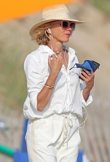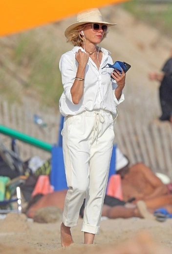Актриса Наоми Уоттс проводит конец июля вместе с друзьями на элитных пляжах Хэмптонса. Для встречи с давними знакомыми муза Дэвида Линча подбирает стильные наряды, которые гармонично вписываются в прибрежную атмосферу и навевают чувство легкости и свободы. Знаменитость делает ставку на тотал-лук в оттенках белого: звезда сочетает свободные кремовые брюки и льняную блузу, завершая непринужденный образ плетеной шляпой и солнцезащитными очками в розовой оправе.