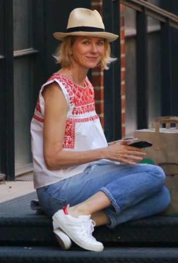 Лето располагает к тому, что прихватить по пути лимонад, холодный чай или кофе. Наоми с детьми решили не терять время даром и совместить полезное с приятным. На этот раз семья разбила на одной из улиц Нью-Йорка точку продажи холодного лимонада и печенья — на радость городским жителям и самим себе. Для этого необычного мероприятия Наоми оделась в приятный летний casual: джинсы, сникерсы, легкая кофта с вышивкой без рукавов и шляпа, чтобы спастись от городского зноя, составили стильный и простой в исполнении образ актрисы.