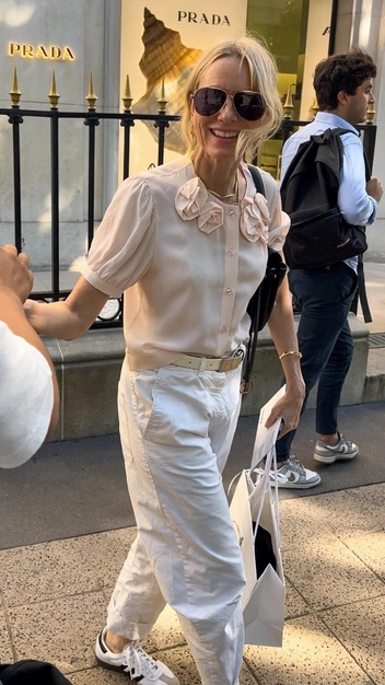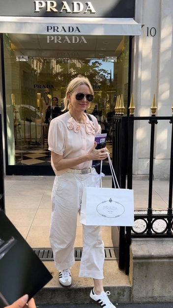 С покупками из бутика Prada Наоми Уоттс вышла стильном образе, который напоминает нам самый модный тренд этого лета. Знаменитость оделась в духе девушки-садовницы. На ней: нежная розовая блуза с рукавами-фонариками и 3D розами, укороченные широкие белые брюки с молочным поясом и базовые кеды adidas. Завершили женственный и в то же время непринужденный выход сумка, очки и украшения.