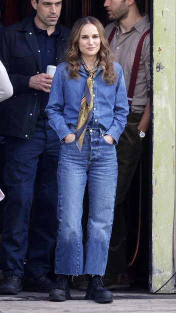 Героиня, которую сыграет Натали Портман в новом фильме Гая Ричи «Источник вечной молодости», точно будет иметь хороший вкус в одежде — убедитесь в этом сами. Папарацци поймали голливудскую актрису во время съемок, и выглядит она безупречно. Она примерила рубашку из денима и заправила ее в джинсы на высокой посадке. К ним Натали подобрала грубые ботинки, сделав акцент на элегантном платке.