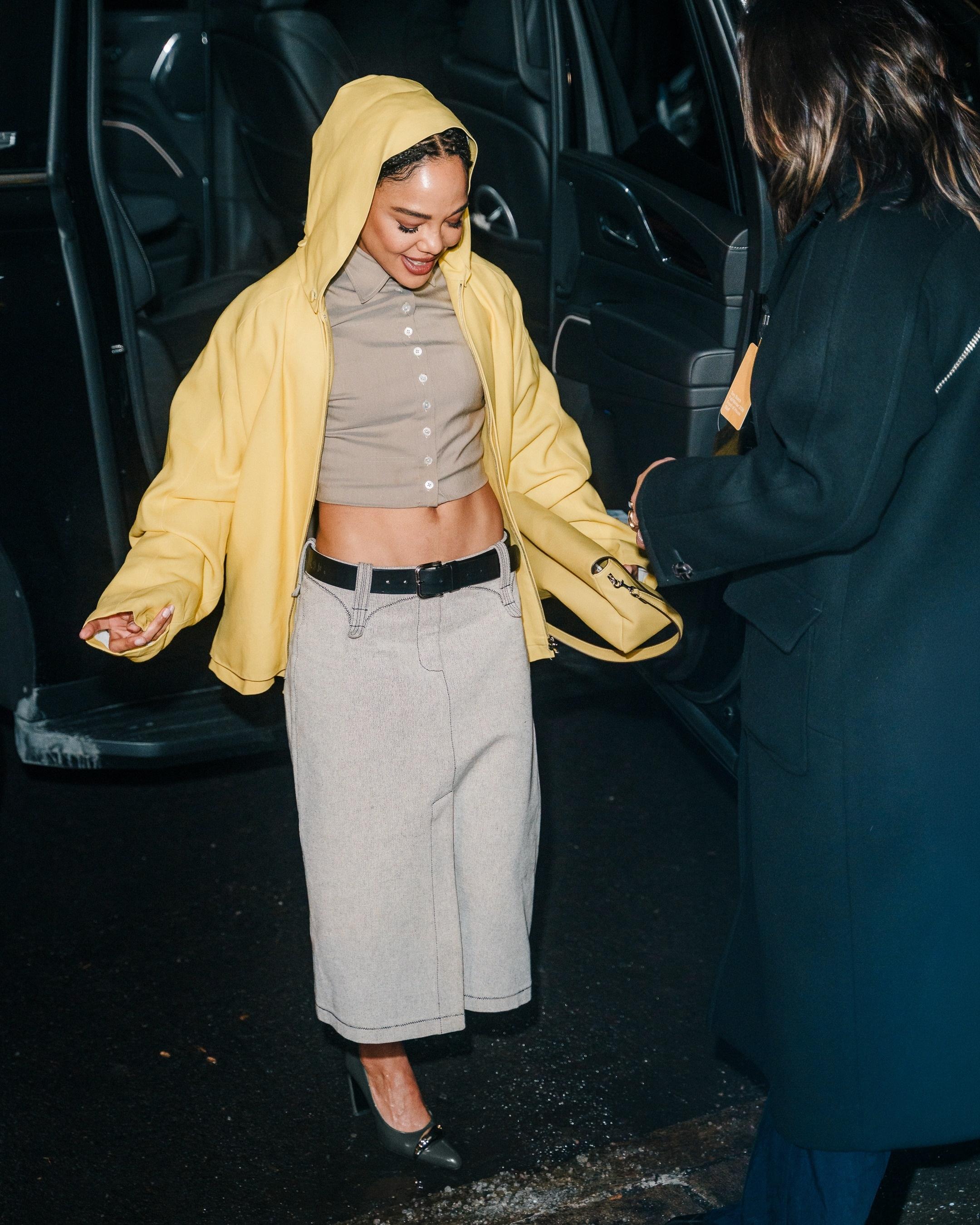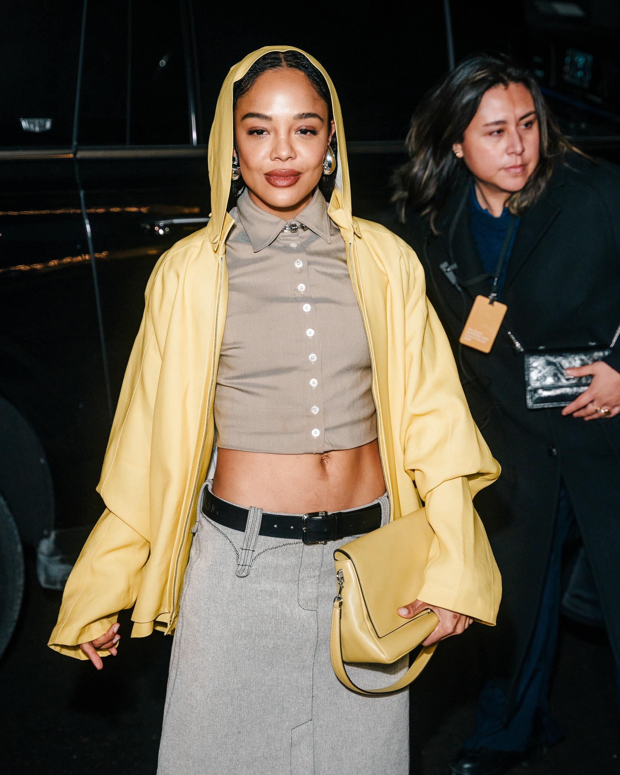 Неожиданно, но факт: Тесса Томпсон превращает капюшон в полноценный вечерний аксессуар. Объемное желтое худи она стилизует как накидку поверх укороченной рубашки и строгой серой юбки‑миди, добавляя к дуэту лодочки и клатч в тон — в итоге капюшон работает уже не как защита от дождя, а как завершающий штрих модного образа. Создается впечталение, что мир высокого кутюра будто случайно встретился со стритвиром, но результат — превзошел все ожидания.