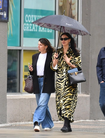 Шелковый тренч с таким рисунком недавно выгуляла Ирина Шейк. Модель сочетала верхнюю одежду с черными балетками и привычной сумкой Hermes — Ирина дополняет ею самые разные образы от спортивных до официальных.
