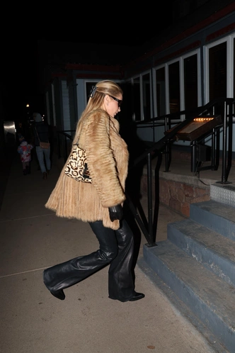 На вечере в ресторане Matsuhisa Белла снова играет в винтажную рок‑диву нулевых: к черным кожаным брюкам и открытому топу‑корсету она добавляет карамельную шубу, узкий плетеный ремень с крупной пряжкой и длинные кожаные перчатки в тон, а завершает образ леопардовой сумкой и блестящим ожерельем, превращая привычный total black в роскошный mob‑wife‑гламур с правильно расставленными акцентами и нужной долей драматизма.