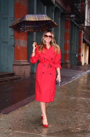 Вместо ожидаемого песочного цвета Хайди Клум выбирает яркий красный плащ, который сразу делает образ более заметным и по-голливудски живым. Строгий крой, пояс на талии и длина миди работают на силуэт модели, а красные туфли и солнечные очки поддерживают это настроение без единого лишнего жеста. В итоге тренч перестает быть просто верхней одеждой и превращается в главного героя всего образа — именно так и выглядит правильный весенний акцент в 2026 году.