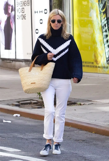 Несмотря на то, что на носу уже лето, прохладная погода все равно нередко застает врасплох. На это у стилистов и экспертов моды есть свое решение – составлять простые многослойные наряды, которые можно «трансформировать» в течение дня. Отличный пример нам подает Ники Хилтон. Звезда предстала перед публикой в повседневном и модном образе: трендовых белых джинсах, темно-синем свитере с контрастной деталью и кроссовках с цветными шнурками. При желании в теплую погоду верхний джемпер можно снять, повязав его на плечи, а в холода надеть обратно.