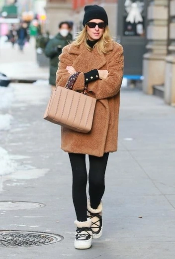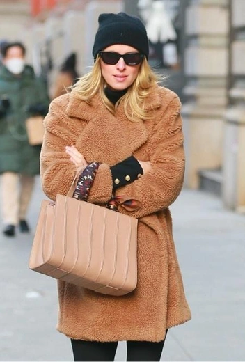 В холодные месяцы Ники Хилтон пускает в ход любимый микс черного и коричневого оттенков, которые идеально сочетаются в рамках зимних стритстайл-выходов. Звезда также выбирает вещи с уютной отделкой из искусственного меха и плюша, дарящие ощущение комфорта даже при взгляде со стороны. Сестра Пэрис Хилтон выгуливает аутфит с черными леггинсами, коричневым плюшевым пальто, дутыми ботинками на меху и шапкой в тон низа. Аутфит завершают черные солнцезащитные очки и сумка-тоут в приятном нюдовом оттенке.