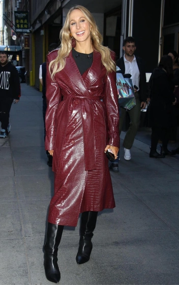 Американская телеведущая Никки Глейсер продолжает носить бордовый цвет несмотря на то, что главным оттенком 2025 года будет коричневый. На этот раз Никки предпочла тренч из лакированной эко-кожи с поясом и глубоким воротом, который сочетала с черным платьем длины мини. Выход телеведущей завершили классический сапоги-трубы и крупные локоны.